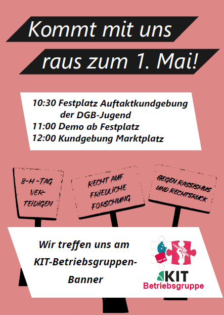 Aussagen von Politiker:innen und auch bei uns am KIT. Dem setzten wir unsere Solidarität entgegen! Liebe internationale, migrantische und von Rassismus betroffene Kolleg:innen: kommt mit uns auf die 1. Mai Demo!