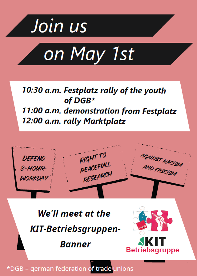 Racist incitement is currently on the rise. At the EU’s external borders, in statements by politicians, and even here at KIT. We counter this with our solidarity! Dear international colleagues, migrant colleagues, and colleagues affected by racism: join us at the May 1st demonstration!
